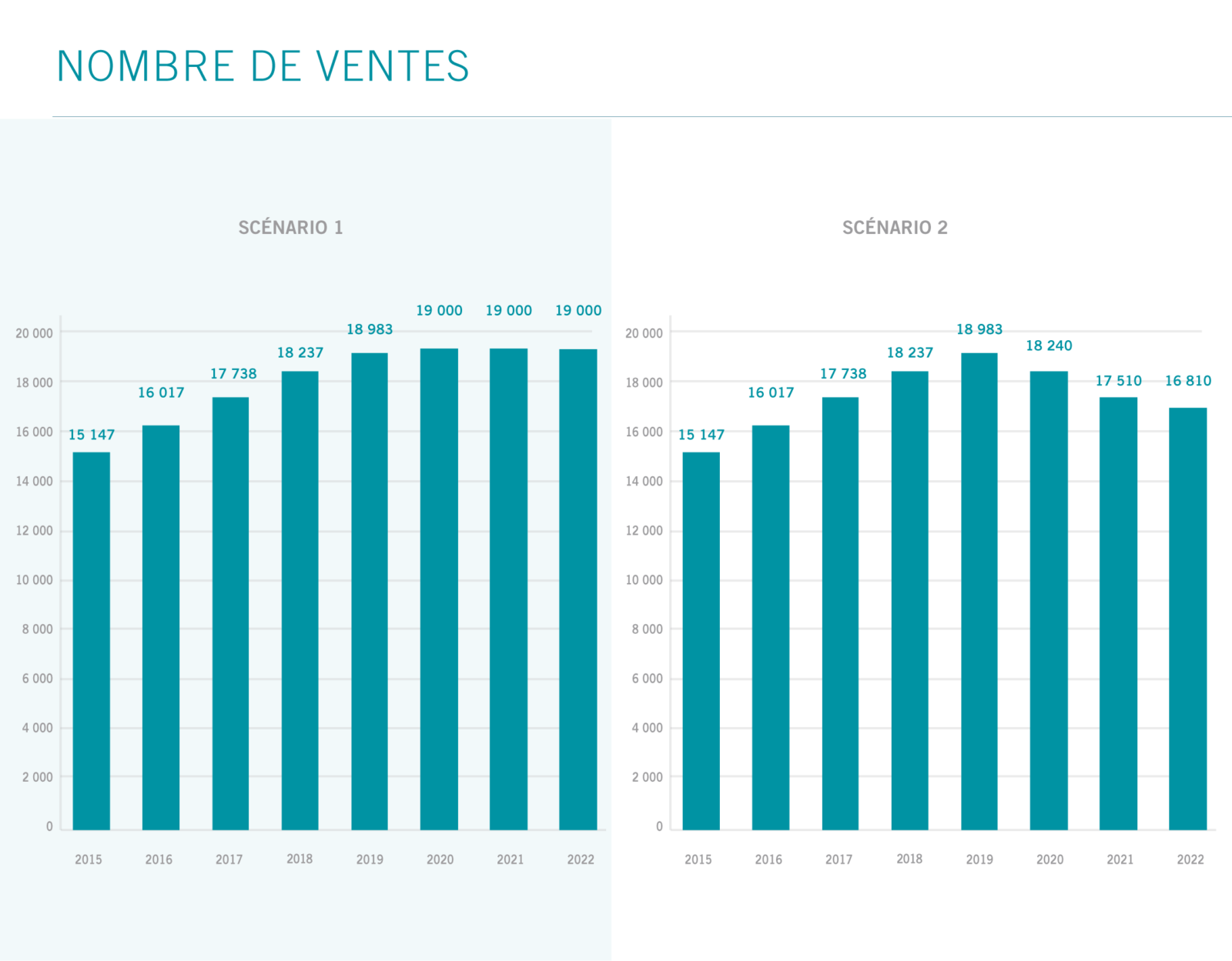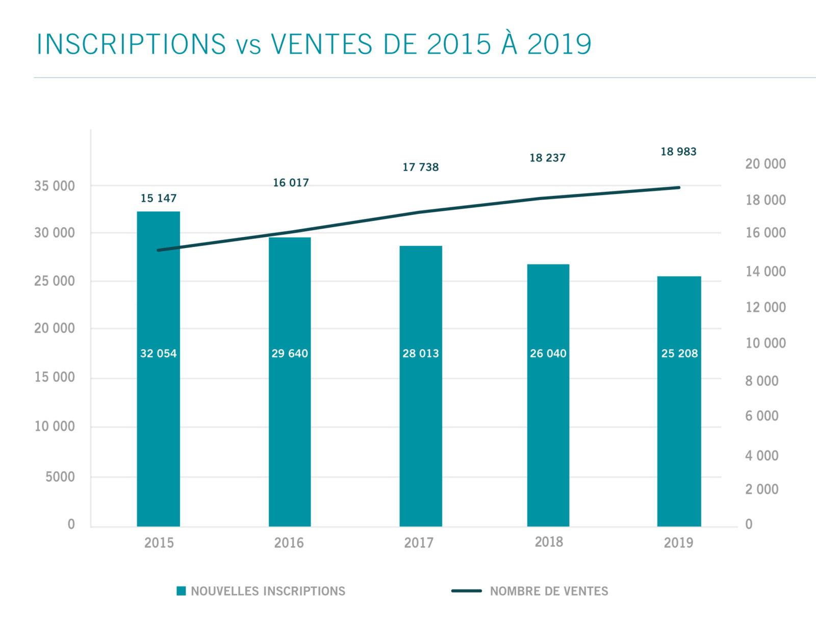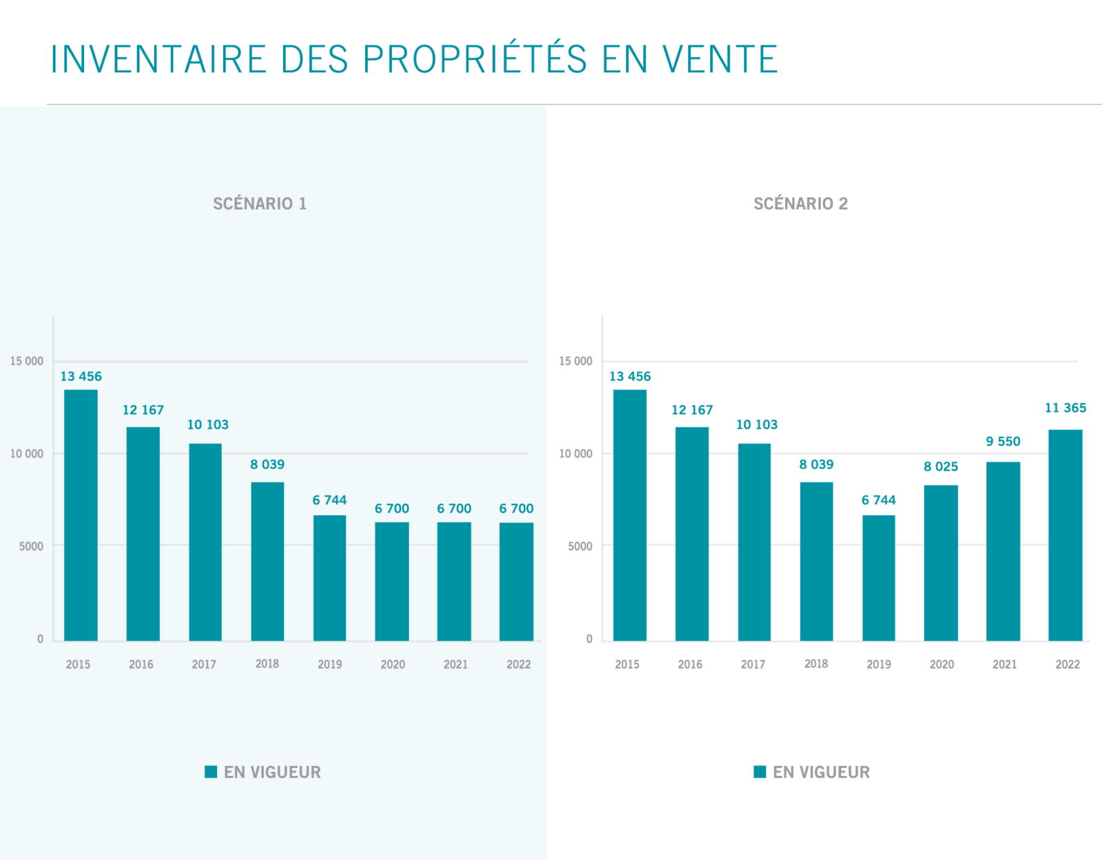 Avant de s’aventurer dans le futur, regardons la situation actuelle : entre 2015 et 2019, on a pu observer une baisse considérable des intentions de ventes, et une baisse encore plus importante de l’inventaire, qui a diminué de plus de la moitié en 5 ans. Cela s’explique en partie par le nombre de vente, en croissance constante.