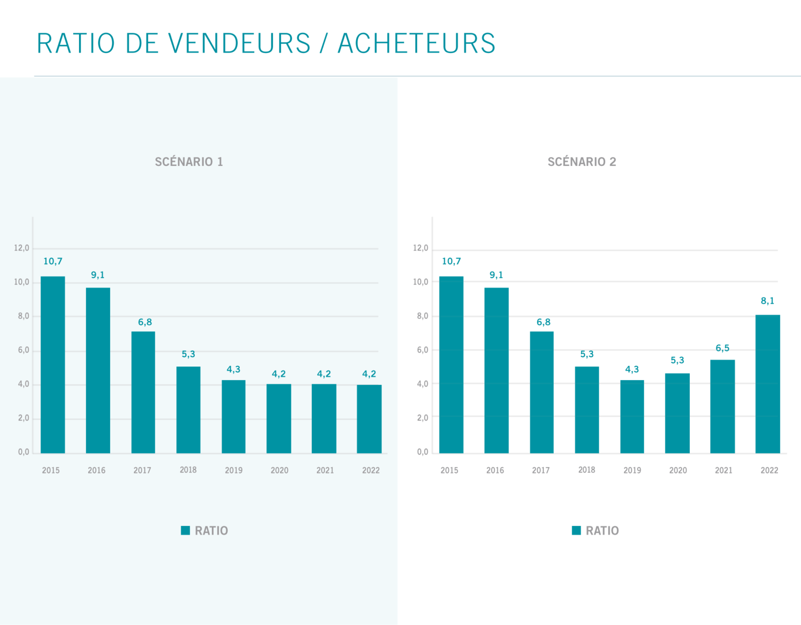 Dans le scénario 2 où nous connaîtrions une baisse du nombre de ventes de 4% par an, accompagnée d’une hausse des intentions de vente elle aussi de 4% par an pour les trois prochaines années. Le marché restera en faveur des vendeurs jusqu’à la fin de 2022 avant de revenir dans un marché en équilibre et la croissance des prix serait d’environ 5% par année pour les quartiers centraux.