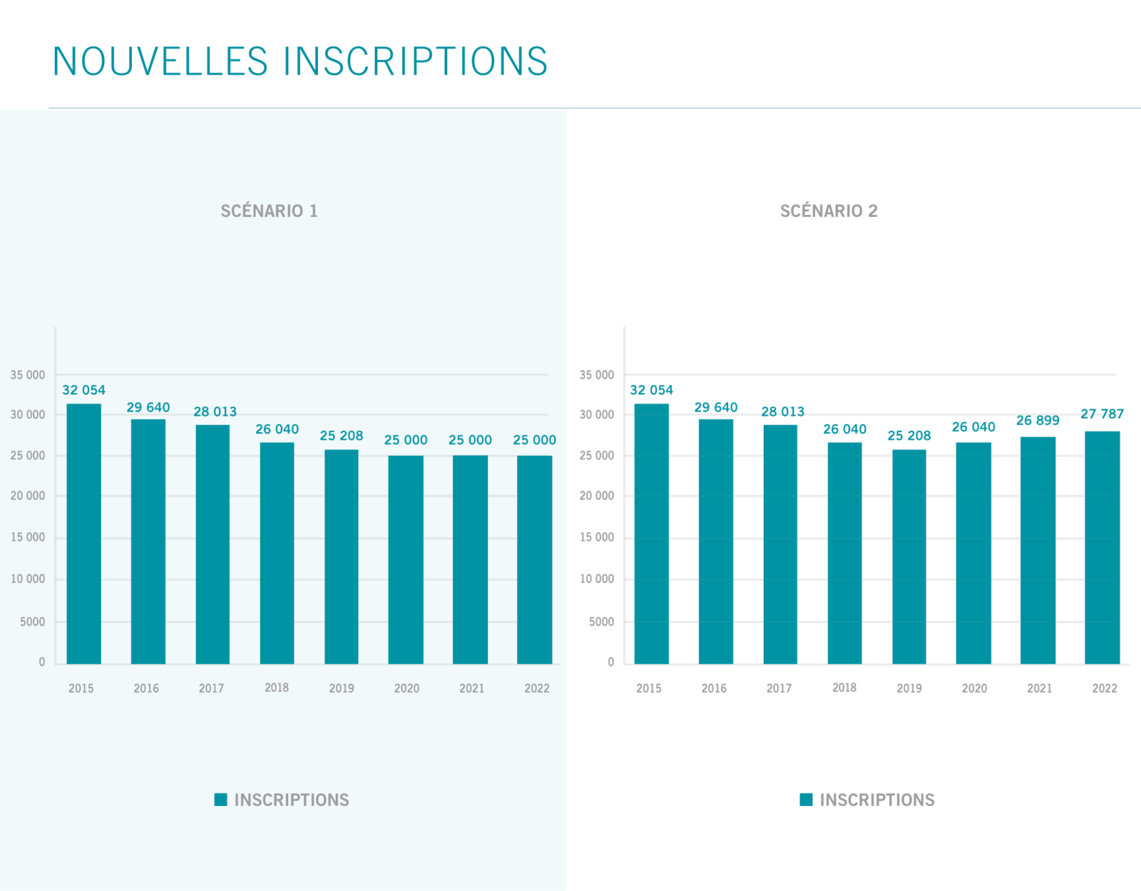 Dans le scénario 1, nous connaîtrions une stabilité du nombre de ventes à 19 000 et une stabilité des intentions de vente à 24 000 pour les trois prochaines années. Le marché serait encore plus serré en faveur des vendeurs à environ 4 vendeurs pour 1 acheteur, et la croissance des prix serait d’environ de 7% pour les quartiers centraux.